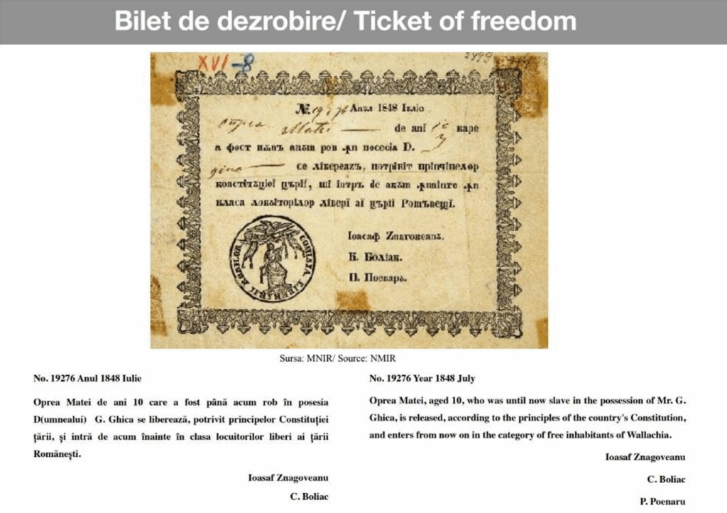 The path toward abolition was equally bureaucratic. In July 1848, a ten-year-old boy named Oprea Matei was officially released from slavery. A document records that he would “enter the class of free inhabitants” of the country. A child who, the day before, had been legally owned, became free through a stamped certificate.